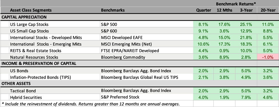The third quarter produced strong results across all major asset classes. Stocks of all sizes and geographies performed well, and bonds also delivered solid returns.