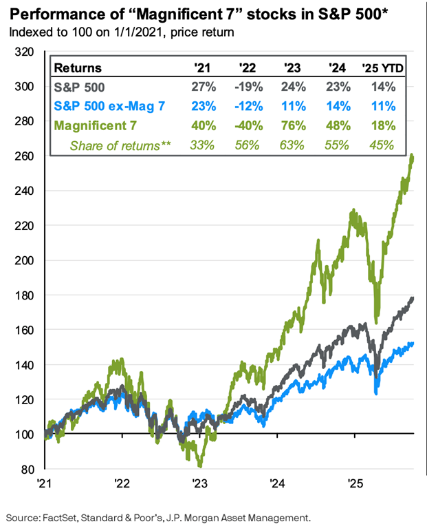 To the question of why the S&P 500 has done so well recently, we need look no further than the Magnificent 7. We use that moniker as shorthand, recognizing both that the seven are exposed to AI to quite varying degrees and also that there are other important companies beyond the seven participating (including OpenAI, which is still not publicly traded). This array of companies is making massive investments in AI infrastructure. Investors are rewarding them handsomely with higher valuations, and the cumulative market success of these companies means they now comprise a record large portion of the market (the largest ten companies in the S&P 500--all but two of them technology companies--made up more than 40% of the index weight at quarter end).